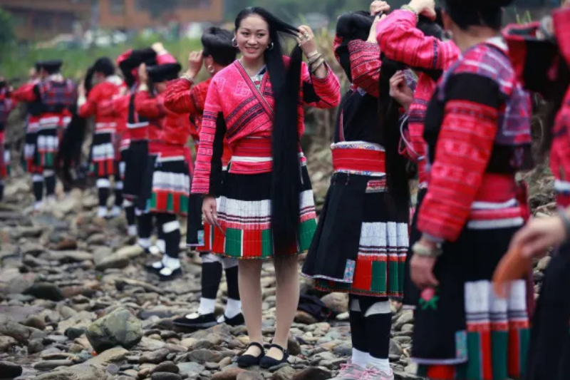 Huangluo is home to the Red Yao women, known for their jet-black hair that can grow up to 2.1 meters (6.8 feet) long. This village even holds a Guinness World Record as the “world’s longest hair village.” Their hair stays strong, shiny, and free of grey well into old age—thanks to rice water, a milky liquid left after rinsing or boiling rice. This beauty secret has been used for centuries, by both village women and ancient princesses.
